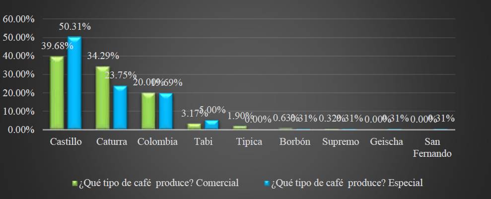 De forma general, el tipo de café especial que se produce en mayor cantidad es el de la variedad Castillo, con un porcentaje del 50.31%. En cuanto a la categoría, la mayoría de este café especial se clasifica como Comercial, con un 39.68%. Le sigue el café con la variedad Caturra donde el 34,29% corresponde al café comercial, mientras que el 23.75% corresponde a café tipo especial. Continúa en tercer lugar el café con la variedad tipo Colombia, donde el 20% corresponde al café de tipo comercial, mientras que el 19.69% corresponde al café tipo especial de la misma variedad. Así mismo se tiene el café con la variedad Tabi, donde el tipo de café especial corresponde al 5%, mientras el tipo de café comercial representa el 3.17% de esta variedad.
