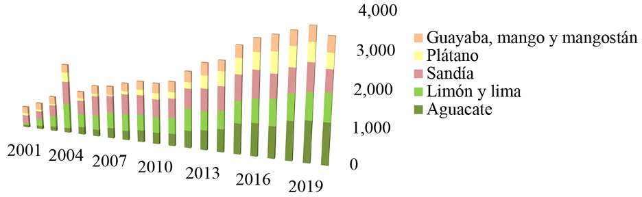 Las exportaciones en toneladas de frutas correspondientes al comercio mexicano con el mundo han ido creciendo a lo largo de 20 años. México ha aumentado tres veces el volumen en toneladas de sus exportaciones de 2001-2020. Se puede apreciar que los datos para el caso de la sandía, plátano, guayaba, mango y mangostán bajaron sus valores en toneladas, mismos que pueden deberse a problemas de trasferencia de datos por pandemia.