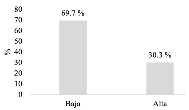 Respeto al nivel de FIRA en niños menores de cinco años, la mayoría presentó un nivel bajo de FIRA (69.7 %), mientras que el 30.3% alcanzó un nivel alto. En términos generales, se observó que casi siete de cada diez participantes se ubicaron en el nivel bajo, (Figura 2).