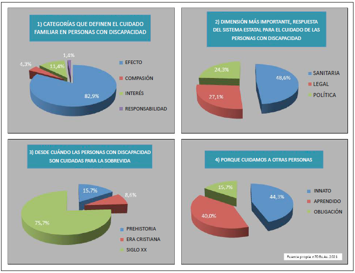 La práctica del cuidado es mediada por un proceso evolutivo impulsado por el efecto de la cultura donde se desarrolla, condicionada por la dimensión del grupo y su dinámica, la cual puede estar favorecida por el lazo vincular. Si asumimos, a modo de una primera aproximación sobre esta problemática, como refleja la encuesta, que el motor del cuidado es el afecto, dichas acciones permanecerán a lo largo del tiempo y en óptima calidad de prestación, ya que están sostenidas en un lazo vincular, como una fuerza motriz que genera técnicas, leyes y servicios.