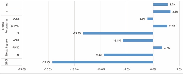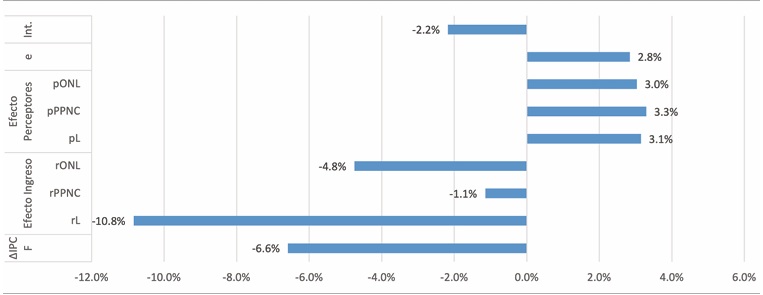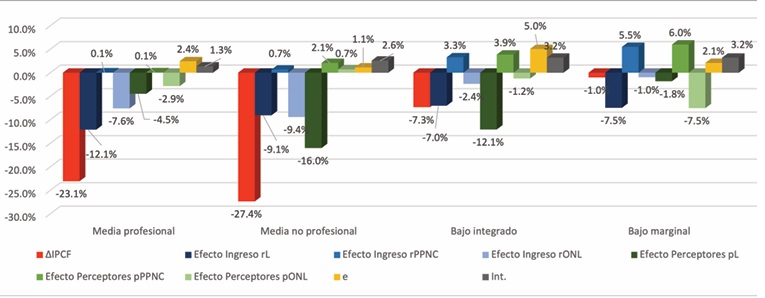 Se podría suponer que los efectos de los cambios ocurridos en las condiciones socioeconómicas y las diferentes estrategias seguidas por los hogares en la estratificación socioeconómica presentaron un comportamiento diferencial. En primer lugar, se observó que los estratos registraron pérdidas de distinta intensidad en sus ingresos per cápita (∆ipcf), y los estratos más altos tuvieron los descensos de mayor intensidad. Ahora bien, también es relevante evaluar los factores explicativos de la caída de ingresos en cada uno de los estratos (véase gráfico 2).