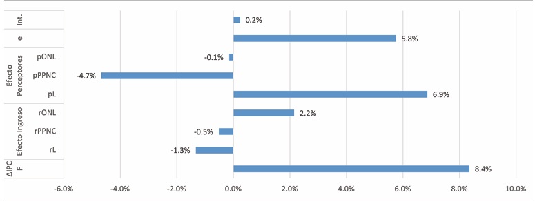 El crecimiento en la cantidad de perceptores por programas sociales y pensiones no contributivas (pPPNC), así como el aumento del ingreso promedio de dicha fuente (rPPNC) operaron en sentido inverso (2.7 y 1.7%, respectivamente), compensando parte de la pérdida de poder adquisitivo de los hogares. Esto daría cuenta de que los ingresos provenientes de programas de protección social contribuyeron, aunque no de manera acabada ni suficiente, a mantener niveles básicos de subsistencia económica. Se expresan aquí los instrumentos previamente referidos, como el programa IFE y los refuerzos económicos a las prestaciones sociales. Asimismo, el factor sociodemográfico (e) incidió al amortiguar la caída de ingresos per cápita debido a un descenso en la cantidad de miembros por hogar.17