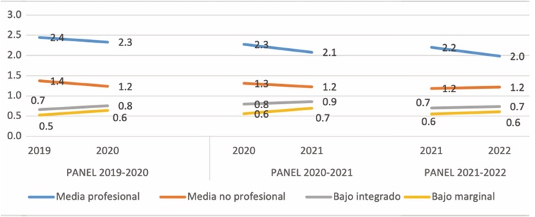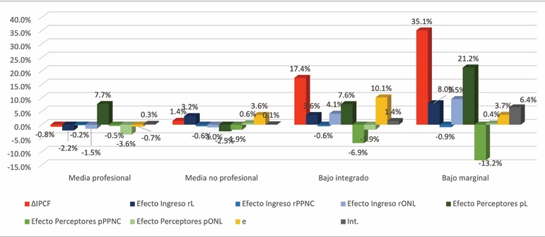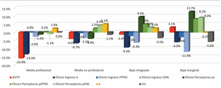 En el estrato medio profesional, la reducción del ingreso per cápita tuvo como principal determinante la fuente laboral, más que nada a través de un efecto ingreso (rL) (-13.4%). Esto evidenciaría que los estratos profesionales no recuperaron sus ingresos o sus horas trabajadas. En el estrato medio no profesional, el leve descenso en el bienestar económico de los hogares en este periodo se explicó también, principalmente, por pérdidas en remuneraciones del mercado de trabajo (rL), aunque de menor envergadura (-6.7%). En los estratos más bajos no solo las remuneraciones laborales tuvieron efecto regresivo, lo mismo ocurrió con los ingresos por programas sociales y pensiones no contributivas (rPPNC), pero en dichos estratos el aumento de personas generadoras de recursos (laborales y no laborales) contrarrestó la pérdida en los ingresos medios por perceptor. Es decir, los resultados revelan que la compensación de poder adquisitivo a través de la intensificación en el número de perceptores se evidencia fundamentalmente en los estratos más desfavorecidos de la estructura ocupacional.