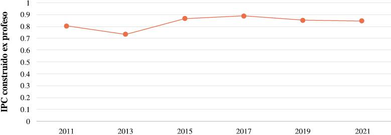 Para la presente investigación se usaron las respuestas a la pregunta del ENCIG que decía: “La corrupción es una práctica que sucede cuando un servidor público o empleado del gobierno abusa de sus funciones para obtener beneficios personales como dinero, regalos o favores por parte del ciudadano. Por lo que usted sabe, en (ESTADO) estas prácticas son: ”. Los encuestados debían elegir entre “muy frecuente”, “frecuente”, “poco frecuente” o “nunca se dan”. Para construir este índice de percepción de la corrupción, se dividió el número de personas que eligieron las opciones muy frecuente y frecuente entre el número total de encuestados que respondieron. En la Figura 1 se muestran en el eje vertical esta proporción de encuestados que señalaron que la corrupción es frecuente. Como se observa, el IPC es más o menos homogéneo a través del tiempo. El nivel más bajo de la percepción de la corrupción ocurre en el 2013.