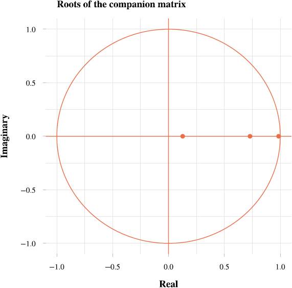 En un modelo PVAR es importante la estabilidad dinámica del modelo. Para ello debemos observar el valor de sus raíces características. Con esto se asegura que, ante choques de corto plazo, las variables regresen a su trayectoria en el largo plazo. Si no se diera el caso, se tendría un modelo explosivo, lo que no tendría sentido económico (Domínguez y Venegas, 2015). Esto puede ser corroborado con la prueba de la estabilidad que se muestra en la Figura 10.