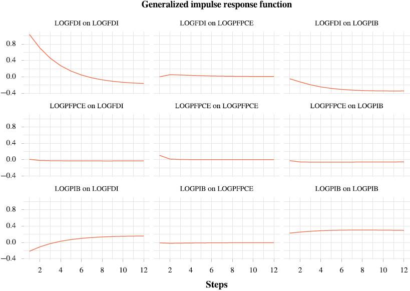 Las funciones de impulso respuesta (FIR) en el modelo PVAR pueden calcular el impacto que un shock tiene en cada una de las variables endógenas sobre las demás variables. Por último, después de estimar las funciones de impulso-respuesta, se puede llevar a cabo la descomposición de la varianza del error de predicción con el propósito de determinar en qué porcentaje las variables endógenas explican la volatilidad de las demás variables endógenas. (Cajas et al., 2022).
