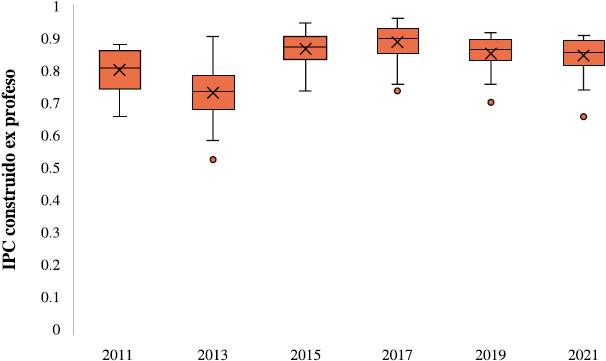 La Figura 2 muestra la distribución de los índices de percepción de corrupción de los estados a través de los años. La línea intermedia de la caja representa la mediana y la equis es el dato para el promedio. Como se observa, el IPC tiende a disminuir y aumentar periódicamente. Dado que la disminución coincide con el inicio de los cambios de gobierno, podemos suponer que la renovación de las estructuras gubernamentales propicia una mejor percepción de la calidad institucional. Este cambio periódico de la disminución y aumento de la confianza en el gobierno ha sido reportado por Beck et al. (2020). Estos autores argumentaron que los cuatro presidentes electos después del año 2000 cuentan con una alta aprobación un año después de haber sido elegidos; sin embargo, la aprobación disminuye al punto de considerarlos como gobiernos perdidos. Parece que las expectativas de un buen gobierno están ligados a la reducción de la percepción de la corrupción, la mejora de la equidad económica y la seguridad pública.