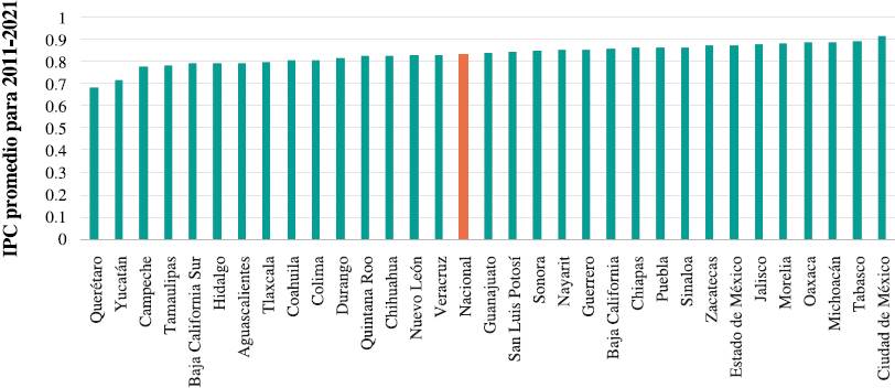En la Figura 3 se detalla el promedio de la percepción de la corrupción para cada estado para el periodo 2011-2021. El promedio nacional se muestra como referencia. Se observa que el promedio del IPC es más o menos homogéneo en los estados. También se nota que 15 estados se perciben menos corruptos que el promedio nacional, siendo Querétaro el estado percibido como menos corrupto.