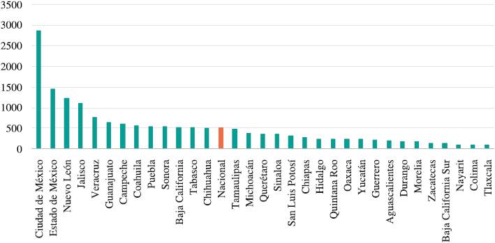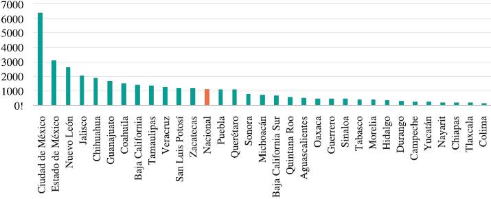 En la Figura 5 se detalla el promedio del PIB por cada estado en el total del periodo junto con su promedio nacional. Como se observa, el promedio del PIB es muy heterogéneo en los estados en el total del periodo. Trece estados tienen un mejor PIB que el promedio nacional, siendo Ciudad de México, Estado de México, Nuevo León y Jalisco los estados con mejor PIB estatal.