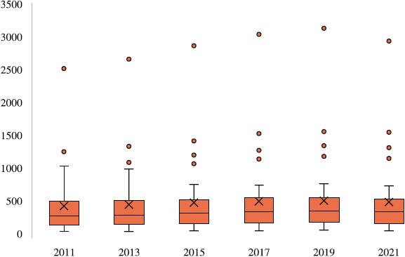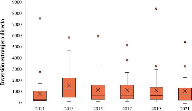 La Figura 9 muestra la distribución de la IED a través del periodo de 2011 a 2021. El 75% de los estados, del 2011 al 2021, se encuentran en una IED menor a 3000. Se puede observar también a los estados que son consistentes con una IED alta, son la Ciudad de México, el Estado de México, Nuevo León y Jalisco.