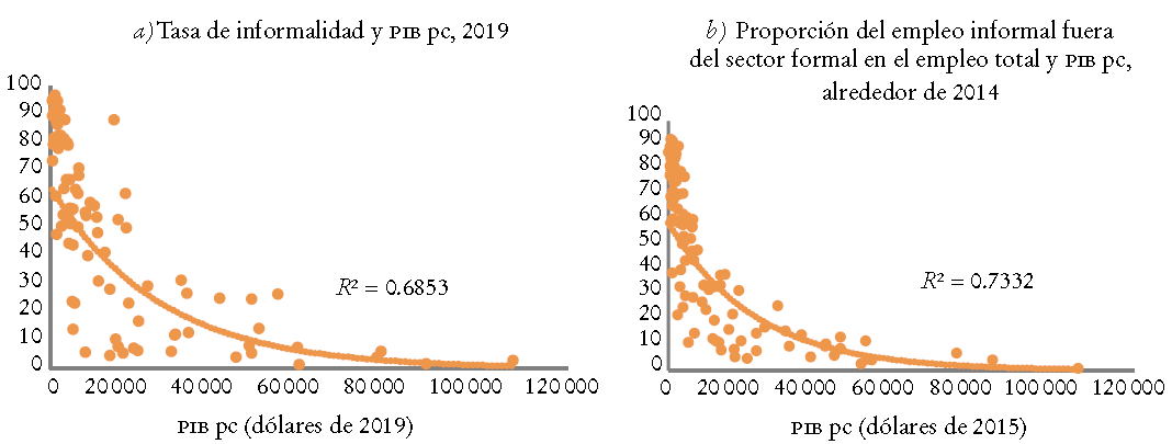 Tanto el cruce de los indicadores del producto interno bruto per cápita (PIB pc) y la proporción del empleo informal -por ejemplo, en SalazarXirinachs et al. (2018); OIT (2018); Chacaltana, Bonnet y García (2022) - como estudios econométricos (Maloney, 2001; Loayza y Rigolini, 2006) muestran que el grado del desarrollo económico es el factor clave para incidir en los niveles de informalidad.