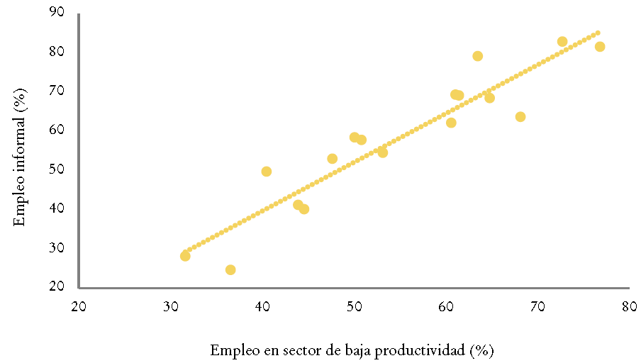 Si bien en este caso tales sectores se identifican con base en aspectos institucionales según el nuevo concepto de la OIT, su tamaño está estrechamente vinculado con aspectos estructurales. En la Gráfica 2 se muestra para América Latina que hay una alta correlación entre el nivel de la informalidad laboral y la proporción de los empleos que en la medición de la CEPAL y el PREALC / OIT habitualmente han sido utilizados para representar al sector de baja productividad y al sector informal en su interpretación estructural.28