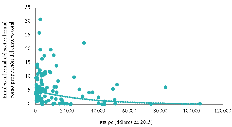 Mientras que los datos presentados hasta ahora subrayan que el nivel de la informalidad laboral depende en gran parte del tamaño del sector informal, y que éste se relaciona estrechamente con aspectos estructurales, surge la pregunta por el peso de la informalidad laboral en el sector formal. En la Gráfica 3 se muestra la proporción del empleo informal en el sector formal según el PIB per cápita.