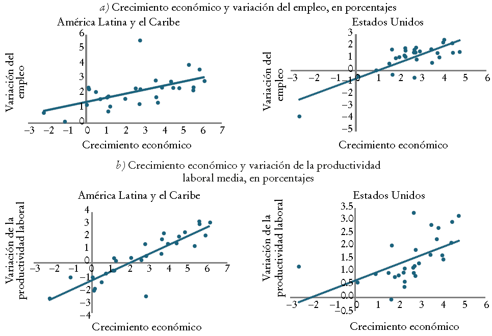 De todos modos, América Latina es una región heterogénea y la relación entre el empleo y el crecimiento económico varía entre los países. En vista de la estrecha correlación entre el crecimiento económico y la evolución del empleo asalariado, no sorprende que la correlación entre el crecimiento económico y el empleo en su conjunto aumente con la proporción de asalariados en la estructura ocupacional (Weller y Kaldewei, 2014: 76).