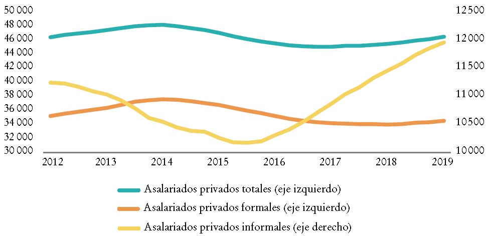 Sin embargo, en 2015 inició un periodo de contracción o de muy bajo crecimiento del PIB y el número de asalariados formales empezó a caer. Durante ese año la cantidad de asalariados informales continuó con su descenso, pero posteriormente primero se estabilizó y después empezó a crecer. En vista del mencionado comportamiento procíclico del producto del sector informal, este aumento no puede ser consecuencia de una expansión de la producción de empresas informales, sino que debe ser resultado de procesos de informalización laboral en las empresas formales, las cuales pueden haber informalizado parte de su fuerza de trabajo o subcontratado a otras empresas cuyos trabajadores eran informales.