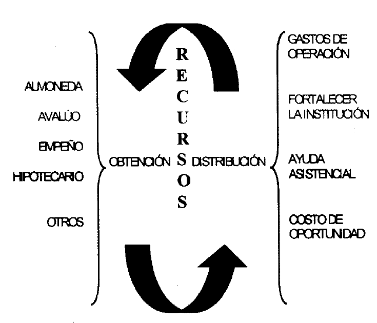 Este par de actividades, que pudieran parecer excluyentes, pueden verse como complementarias o paralelas a través de la Figura 1. En primer lugar se muestra el mecanismo de obtención de recursos que en el Nacional Monte de Piedad se logra a través de actividades como: Almoneda, Avalúo, Empeño, Crédito Hipotecario, y otros que puedan desarrollarse en su momento.