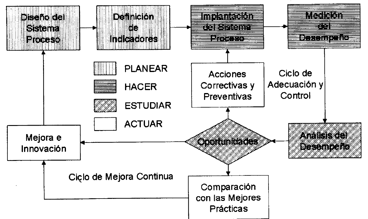 Esto supone entonces, que adicionalmente a los dos elementos identificados con anterioridad, tenemos que agregar un sistema de administración y mejora de procesos. Este mecanismo será el que garantizará que las operaciones de administración cuenten con la capacidad de adecuación y mejoramiento continuo, indispensables en cualquier sistema de aseguramiento de calidad.