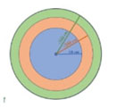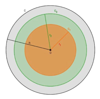 Este corte corresponde a considerar dos coronas circulares y un círculo central. A partir de la circunferencia C de centro O y radio R, se trazan dos circunferencias concéntricas, denotadas por C1 y C2. Los radios de cada una de estas circunferencias, respectivamente, son denotados por C1 y r2.