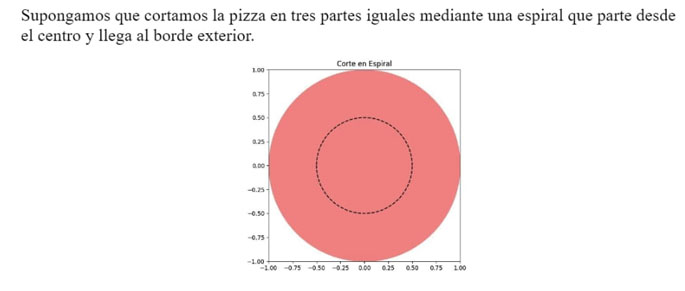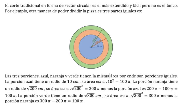 La pizza se puede particionar en tres superficies de igual área, donde cada parte corresponde al círculo determinado por la circunferencia C1 (zona anaranjada en la figura 2), la corona circular denominada central, delimitada por las circunferencias C2 y C1 (zona verdosa en la figura 2), y la corona circular delimitada por las circunferencias C y C2 (zona gris en la figura 2). Para determinar tres superficies de igual área se debe establecer la relación entre los tres radios: R, r1 y r2. Se concluye que r1=33R y r2=63R lo que permite demostrar la equivalencia de áreas a partir de estos radios.