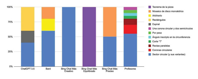 Este trabajo reporta resultados de una investigación de tipo exploratoria. Se analizan las respuestas que aportaron ocho profesores al estudio del problema de la pizza, y las respuestas que generaron al mismo problema los siguientes recursos de IAG: ChatGPT 3.5 (ChatGPT), Google Bard y Bing Chat (en sus tres modalidades: más creativo, más equilibrado y más preciso). Analizamos diferencias y similitudes de estas resoluciones en términos de las siguientes categorías de análisis: el tipo de corte propuesto, el sistema de representación predominante en el cual se realiza la resolución, el nivel de validación matemática y el tipo de resolución (correcta, incorrecta o inconsistente). Los chatbots considerados basan la generación de texto en distintos modelos de lenguaje: GPT 3.5 (Brown et al., 2020) en el caso de ChatGPT; GPT 4 (OpenAI, 2023) en el caso de Bing Chat y PaLM-2 (Chowdhery et al., 2023) en el caso de Google Bard. Los modelos subyacentes a estos chatbots si bien se encuentran todos basados en una misma arquitectura de aprendizaje profundo, difieren principalmente en su escala y capacidades de generación de lenguaje, además de haber sido entrenados sobre subconjuntos de datos diferentes. La inclusión de múltiples chatbots tiene por objetivo analizar y comparar las respuestas generadas por cada uno de ellos, ya que la precisión, diversidad y capacidades en general de cada LLM varía. Se seleccionaron estos tres chatbots de propósito general por ser los que se encuentran disponibles de manera libre y ser los más ampliamente adoptados entre estudiantes y docentes.