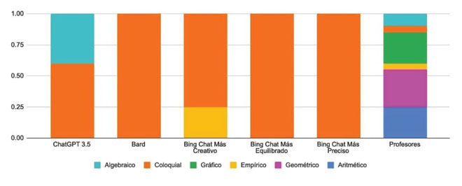 C2: Categoría 2. Sistema de representación preponderante: Se observó mayor variedad de sistemas de resolución en las propuestas de los profesores que en las de los chatbots. El sistema de resolución más frecuente propuesto por los chatbots fue el coloquial, mientras que entre los profesores se advirtió una misma proporción entre los tipos de resolución gráfico, geométrico y numérico (figura 12). El nivel algebraico, que matemáticamente sería el más indicado para resolver este tipo de problemas, fue propuesto por un único chatbot (ChatGPT) para algunas de sus resoluciones, y por una muy baja proporción de los profesores. En el caso de estos últimos, preocupa que el sistema de representación preponderante para su resolución no haya sido el algebraico, debido a que son quienes forman a nuestros estudiantes de secundaria en matemática. En el caso de los chatbots, se esperaba también un mayor uso del sistema algebraico, pues es el sistema de representación que tiene mayor potencial para resolverlo. Sin embargo, que hayan usado el sistema de representación coloquial se condice con su creación. Este resultado brinda un espacio de discusión en los colegios, con los estudiantes para evitar considerar a los chatbot perfectos y omniscientes (que lo saben todo).