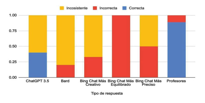 La figura 15 sintetiza la distribución del tipo de respuesta (correcta, incorrecta e inconsistente) ofrecidas por chatbots y profesores.