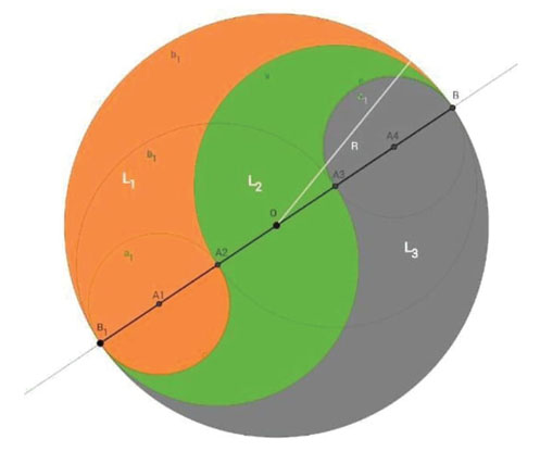 La clave de este corte es la trisección del radio R de la circunferencia C de centro O. Esta trisección puede realizarse con diversos procedimientos matemáticos que involucran nociones tales como Teorema de Thales, vectores, entre otros. Luego, formar semicírculos cuyos centros son puntos correspondientes a esa trisección. Considerando estos semicírculos, se forman tres superficies denominadas lágrimas. Por ejemplo, para la lágrima de la izquierda (de color anaranjado en la figura 3), se considera el semicírculo inferior de centro A1 y radio A1A2_ más la superficie resultante de quitarle al semicírculo superior de centro O y radio R el semicírculo superior de centro A3 y radio A3B_. De forma análoga, se construyen las dos restantes lágrimas: la central (de color verde en la figura 3) y la derecha (de color gris en la figura 3).