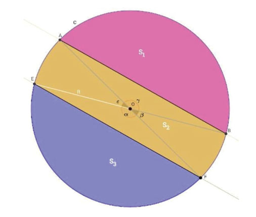 Este corte involucra nociones tales como: ángulo inscripto en la circunferencia, cuerda, ángulo central, sector circular, segmento circular, etc., y las propiedades entre estos elementos. El corte consiste en determinar la amplitud del ángulo alfa inscrito en la circunferencia (figura 8), de forma que las tres superficies delimitadas por este ángulo tengan igual área. Las superficies son dos segmentos circulares (el verde y el rojo en la figura 8) formados por las cuerdas que forman el ángulo α y sus respectivos arcos de cuerda, y una superficie central (color azul en la figura 8) comprendida entre las cuerdas que conforman el ángulo. Para garantizar que las tres superficies tienen igual área, se debe determinar el ángulo alfa, lo que conduce a un profundo trabajo geométrico y algebraico.