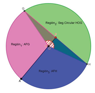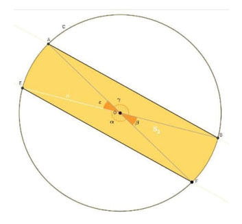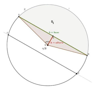 Por ejemplo, para calcular el área del segmento circular comprendido entre la cuerda AB y su arco (zona rosa en la figura 4 y denotada por S1) se puede realizar la resta entre el área del sector circular delimitado por el ángulo (zona gris en la figura 5) y el triángulo OAB. El área del sector circular es πR2γ360. Para el área del triángulo OAB, es necesario recurrir a las razones trigonométricas en la circunferencia C. Así se obtiene que la altura ℎ del triángulo h=R cos(γ2) y la base b=2R sin(γ2) = 2. El área del triángulo OAB es entonces R2sin(γ)2. El área del segmento circular es S1=R2(πγ360sin(γ)2). Para calcular el área de la faja central, esto es, el área comprendida entre la cuerda AB y la cuerda EF (denotada por S2) se puede sumar el área del triángulo OAB, del triángulo OEF, del sector circular delimitado por el ángulo α y del sector circular delimitado por el ángulo β(figura 6). Ambos triángulos, al igual que los dos sectores circulares, tienen la misma área. Entonces, para obtener el área de la faja central, basta calcular el área de un triángulo y de un sector circular.