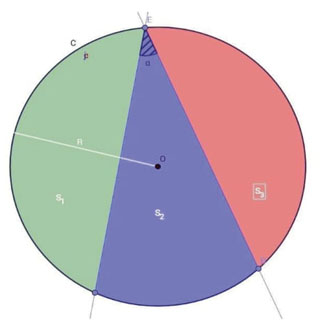 • -C1.5: Ángulo inscripto en la circunferencia: Consiste en determinar la amplitud de un ángulo alfa inscrito en la circunferencia, de forma que las tres superficies delimitadas por este ángulo tengan igual área (figura 8).