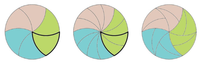 Este corte involucra el concepto de teselado, que implica cubrir completamente una superficie plana con figuras idénticas, de forma tal que no se superpongan y luego, agruparlas de la forma conveniente de manera de obtener tres regiones de igual área. Haddley y Worsley (2015) proponen teselaciones del círculo a partir de diferentes figuras planas construidas con curvas (incluyendo rectas). Si bien, el trabajo de estos matemáticos no refiere exactamente al problema de la pizza, sí es posible utilizar la técnica del teselado para generar un nuevo corte (figura 9).