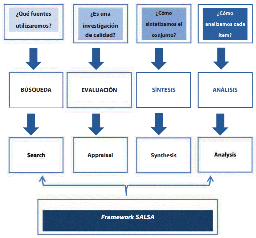 Se siguieron las cuatro fases definidas por un framework representado en la Figura 1, conocido como SALSA, que muestra las etapas de Search (búsqueda), Appraisal (evaluación), Synthesis (síntesis) y Analysis (análisis). Este modelo, propuesto por Grant y Booth (2009), proporciona una estructura metódica que guía el proceso de revisión y análisis de la literatura.