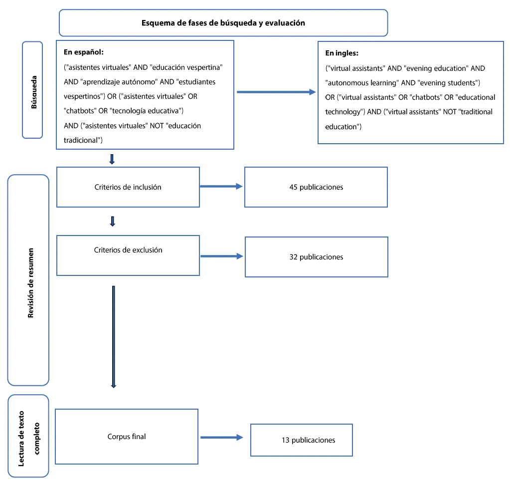 | “asistentes virtuales” AND “educación vespertina” AND “aprendizaje autónomo” AND “estudiantes vespertinos” | “asistentes virtuales” OR “chatbots” OR “tecnología educativa” | “asistentes virtuales” NOT “educación tradicional” |