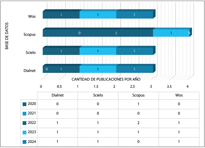 La Figura 3 representa la evolución del número de publicaciones en cuatro bases de datos clave: Dialnet, SciELO, Scopus y WoS, de 2020 a 2024. Este análisis es de suma importancia para comprender no sólo la producción académica en un campo específico, sino también las tendencias y patrones en la investigación a lo largo del tiempo.