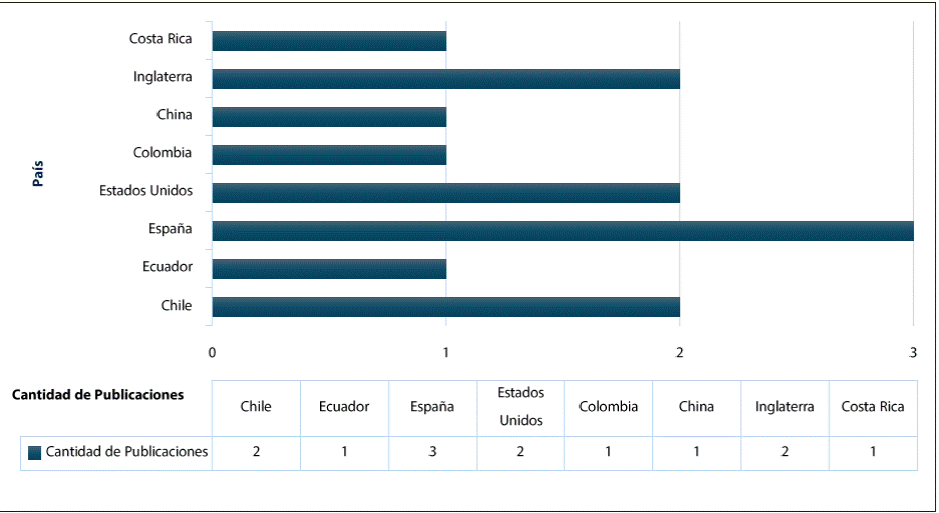 La Figura 4 muestra que España lidera la producción académica con tres artículos, representando el 23% del total analizado, lo que refleja la fortaleza de sus instituciones y un entorno favorable para la investigación. Chile, Estados Unidos (EU) e Inglaterra siguen con dos investigaciones cada uno (15.4 % del total), destacando el papel predominante de EU en la investigación global y el compromiso de Chile e Inglaterra con políticas de financiamiento y calidad académica.