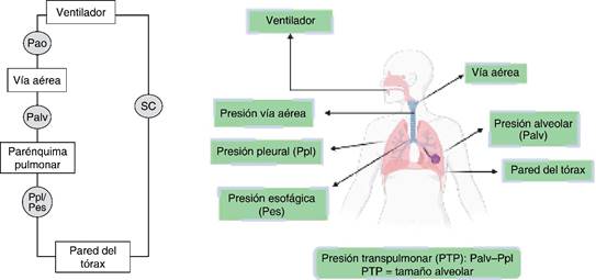 El proceso de la respiración, tanto espontánea como en ventilación mecánica, conduce a un incremento en la presión transpulmonar (PTP). Durante la respiración espontánea, la PTP incrementa por una disminución de la presión pleural (Ppl) producida por la contracción de los músculos inspiratorios y durante la ventilación mecánica la PTP aumenta por un incremento en la presión alveolar (Palv) producido por el empuje de la columna de aire proveniente del ventilador.1 Dicha relación se puede expresar por medio de la siguiente ecuación: PTP = Palv-Ppl (Figura 1); aunque realizar dichas mediciones permitiría dilucidar de forma inmediata la PTP, hasta el momento resulta imposible medir la Ppl, es en este punto que se ha empleado la presión esofágica (Pes) como variable que puede emular el valor aproximado de la Ppl. A lo largo de esta revisión valoraremos el uso de esta herramienta en el paciente obeso, ya que consideramos de suma importancia saber que la finalidad de la ventilación mecánica tiene como objetivo ganar tiempo suficiente para solucionar la causa que llevó al paciente a depender del ventilador, esto se logra por medio del restablecimiento del intercambio gaseoso y reducción del trabajo respiratorio (TR).2