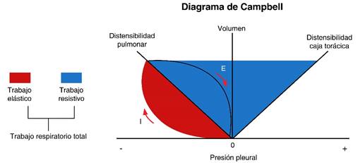 Figura 2: Diagrama de Campbell que muestra el trabajo respiratorio medido por la presión esofágica: trabajo resistivo y trabajo elástico, trabajo relacionado con la actividad muscular y la elastancia de la pared torácica.