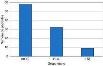 La edad promedio registrada fue 42 ± 15.1 años. Predominaron los pacientes con edades de 20-40 años (n = 57; 57.6%) (Figura 1).