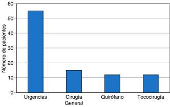 La mayoría de casos (n = 55; 55.6%) procedieron del Servicio de Urgencias, seguido por Cirugía General (n = 15; 15.2%), Quirófano (n = 12; 12.1%) y Tococirugía (n = 12; 12.1%) (Figura 3).