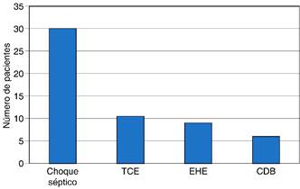 Los diagnósticos de ingreso más frecuentes fueron: choque séptico (n = 30; 30.3%), TCE (n = 11; 11.1%), enfermedad hipertensiva del embarazo (n = 9; 9.1%) y cetoacidosis diabética (n = 6; 6.1%) (Figura 4).