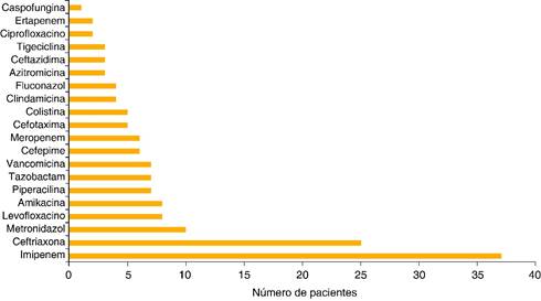 Los antibióticos más utilizados fueron imipenem (n = 37; 37.3%), ceftriaxona (n = 25; 25.2%) y metronidazol (n = 10; 10.1%).