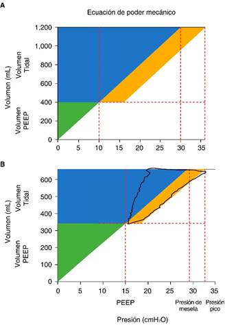 En la Figura 1 se representa la energía que debe ser aplicada al sistema respiratorio para incrementar su volumen, por encima del volumen residual y podemos observar una representación de la ecuación de poder mecánico, que está compuesta por un triángulo grande (en color verde + azul) al que se añade un paralelogramo a la derecha (amarillo).