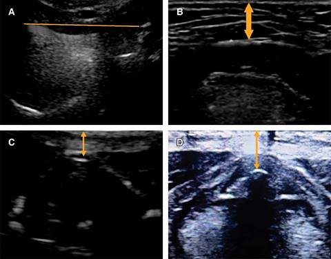 Figura 1: A) Distancia hiomental. B) Distancia piel a hueso hioides. C) Distancia piel a epiglotis. D) Distancia piel a cuerdas vocales.