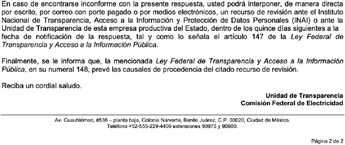 Ser informado del derecho de impugnar o recurrir la falta de entrega de información; y de los requisitos para ejercer este derecho, ya sea de forma parcial o total. Esto quiere decir que se informe a las y los solicitantes, en el caso de México, que cuando se pide información a través a una institución de gobierno -como la Secretaría de Medio Ambiente y Recursos Naturales (SEMARNAT)- o a una empresa productiva del Estado -como la Comisión Federal de Electricidad (CFE)- sobre una manifestación de impacto ambiental o su autorización, los sujetos obligados deben incluir en su respuesta una leyenda en la que establezca el recurso y los medios para impugnarla, tal como se muestra en la siguiente imagen: