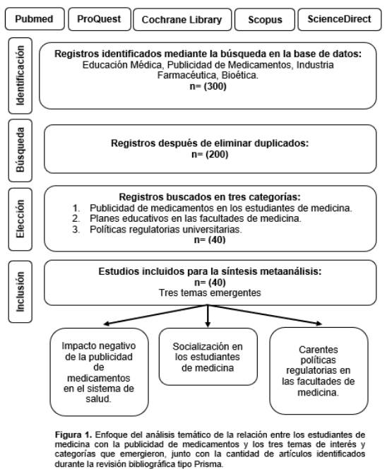 Se obtuvieron 300 estudios científicos en la base de datos, tras eliminar los documentos duplicados, se examinaron 200 artículos académicos enfatizando en tres categorías de estudio: 1) publicidad de medicamentos en los estudiantes de medicina, 2) planes educativos en las facultades de medicina y, 3) políticas regulatorias universitarias. De los cuales se incluyó 40 artículos académicos en la revisión y emergieron tres resultados relevantes: 1) impacto negativo de la publicidad de medicamentos en el sistema de salud; 2) socialización en los estudiantes de medicina; 3) carentes políticas regulatorias en las facultades de medicina. Los datos están expuestos a continuación en la Figura 1.