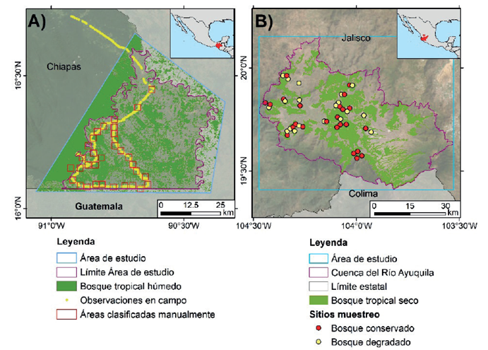 El trabajo se realizó en dos sitios de estudio: 1) un área que cubre el municipio de Marqués de Comillas y Benemérito de las Américas, así como áreas aledañas en el municipio de Ocosingo y 2) La zona de estudio correspondió a la parte occidental de la cuenca del río Ayuquila en Jalisco, la cual se encuentra en los siguientes municipios: Autlán de Navarro, Ejutla, El Grullo, El Limón, Tolimán, Tonaya, Tuxcacuesco y Unión de Tula. En la primera zona de estudio domina el proceso de deforestación, mientras que, en el segundo, la degradación forestal. Por ello, cada sitio fungió como un objeto de estudio ideal para monitorear estos dos procesos.