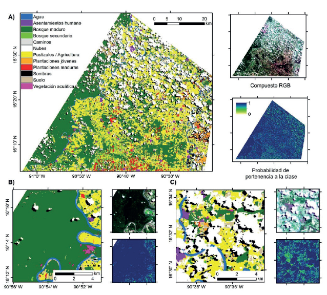 Figura 2 A) Clasificación de cubierta y usos del suelo del área de estudio completa utilizando la U-Net MS + SAR, así como el compuesto RGB y los mapas de probabilidad de pertenencia a la clase correspondiente. B) Ejemplo de un sitio dominado por bosque maduro con altas probabilidades de pertenencia. C) Ejemplo de un área recientemente quemada con una alta presencia de nubes y sombras, donde se observan valores bajos de pertenencia.