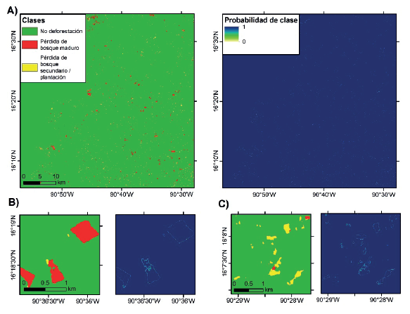 Figura 3 A) Clasificación de las áreas deforestadas de 2019 a 2020 en el área de estudio utilizando la U-Net 3D MS y su mapa de probabilidad de pertenencia a la clase correspondiente. B) Ejemplo de un sitio dominado por deforestación de bosque maduro. C) Ejemplo de un área dominada por deforestación de bosque secundario o plantaciones.