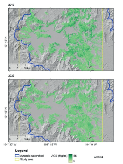 En el caso de la zona de estudio de Ayuquila, esta es una zona de acciones tempranas de REDD+, el programa de reducción de emisiones asociadas a la deforestación y degradación de los bosques. Por ello, en esta zona el estudio se enfocó a tratar de cuantificar la degradación forestal como una reducción en la biomasa del bosque. Estudios previos han reportado que la probabilidad de que un bosque se degrade está asociada con un índice de pobreza y el tamaño poblacional de las localidades cercanas a los bosques (Borrego & Skutsch, 2019; Morales-Barquero et al., 2015); aunque reconocen que esto no necesariamente implica causalidad. Por otro lado, el porcentaje de bosque degradado a nivel municipal en la región está relacionado de manera negativa con la distancia a carreteras y el porcentaje de tierras parceladas (Jiménez-Rodríguez et al., 2022). Sin embargo, estos estudios habían trabajado con la detección del bosque degradado como un problema de clasificación (i.e., bosque degradado vs. bosque conservado) y no como un proceso, es decir como una disminución de la biomasa. Aunque este enfoque resulta mucho más complicado, tiene la ventaja de que considera la variación espacial natural del AGB del bosque, en respuesta a algunas variables biofísicas como la pendiente, el tipo de suelo, entre otras. Aunque los resultados no fueron tan prometedores, se logró obtener un estimado del carbono almacenado en el bosque tropical caducifolio de la zona. Esta predicción no fue muy distinta de lo que se hubiera obtenido al multiplicar el área de bosque tropical caducifolio por el promedio de AGB contenido en una ha. Sin embargo, nuestros resultados permitieron obtener mapas de AGB con una variación espacial que puede ser más realista. En este sentido, consideramos que futuros métodos deberían estar encaminados en tratar de detectar la degradación forestal como un proceso, a pesar de que eso suponga un reto mucho mayor.