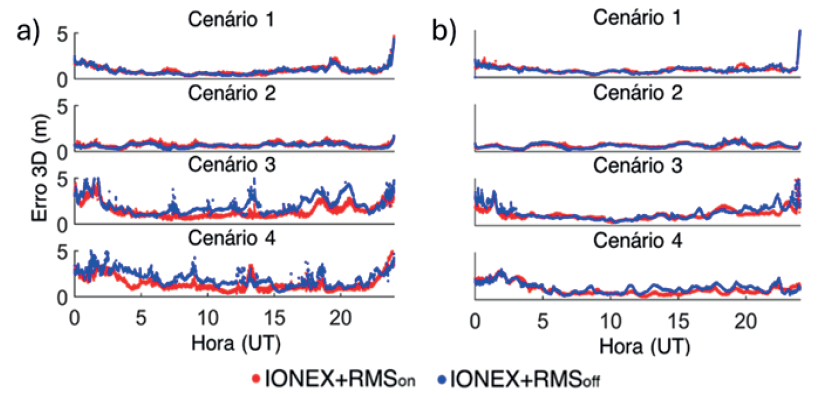 As análises considerando os valores de RMS do erro 3D no posicionamento para cada dia dos cenários, utilizando CODG com e sem as incertezas do VTEC, para as quatro estações confirmam o comportamento observado anteriormente com os valores médios por época (Figura 1), com melhoria no erro obtido no posicionamento com o uso dos valores de incerteza do VTEC, principalmente nos cenários 3 e 4, em específico para as estações SAVO e PPTE. Considerando as taxas de melhorias por estação e produto, CODG apresentou as maiores taxas de melhoria para as quatro estações consideradas. Os valores médios das taxas de melhoria para CODG, UQRG e UQ-6 foram 23%, 14% e 15%, respectivamente. Os testes iniciais deste estudo foram apresentados em Jerez et al. (2021)c, quando foi verificada a necessidade de estudos mais aprofundados. O trabalho completo pode ser consultado em Jerez et al. (2022a), já os principais resultados obtidos foram discutidos em Jerez et al. (2022b).